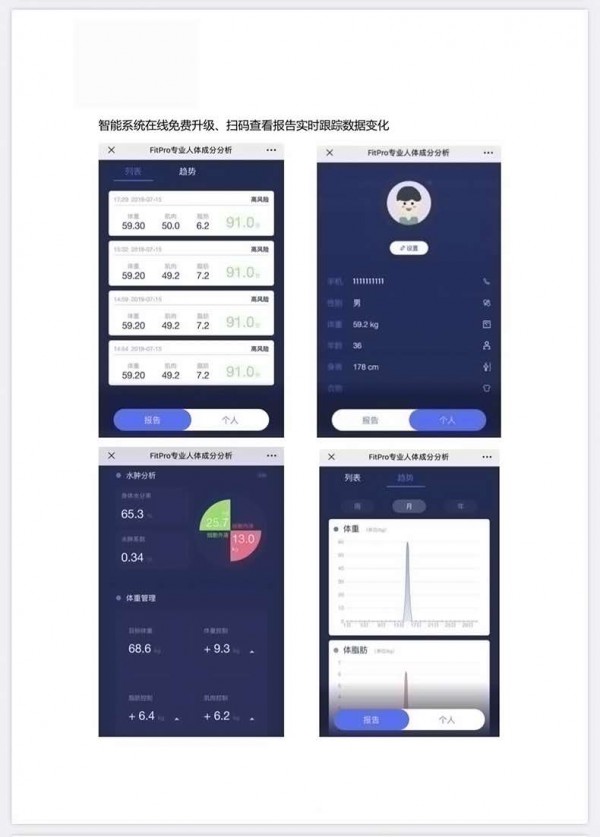FitPro智能體測儀,可以連接will微信掃碼,隨時在手機上查看報告,fitPro體測儀可以直連任何一款惠普打印機,體測儀有著一年質(zhì)保終身維護的售后服務