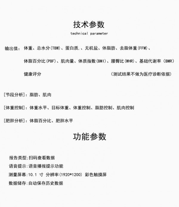 輸出參數(shù):體重、總水分(TBW)、蛋白質(zhì)、無機鹽、體脂肪、去脂體重(FFM)