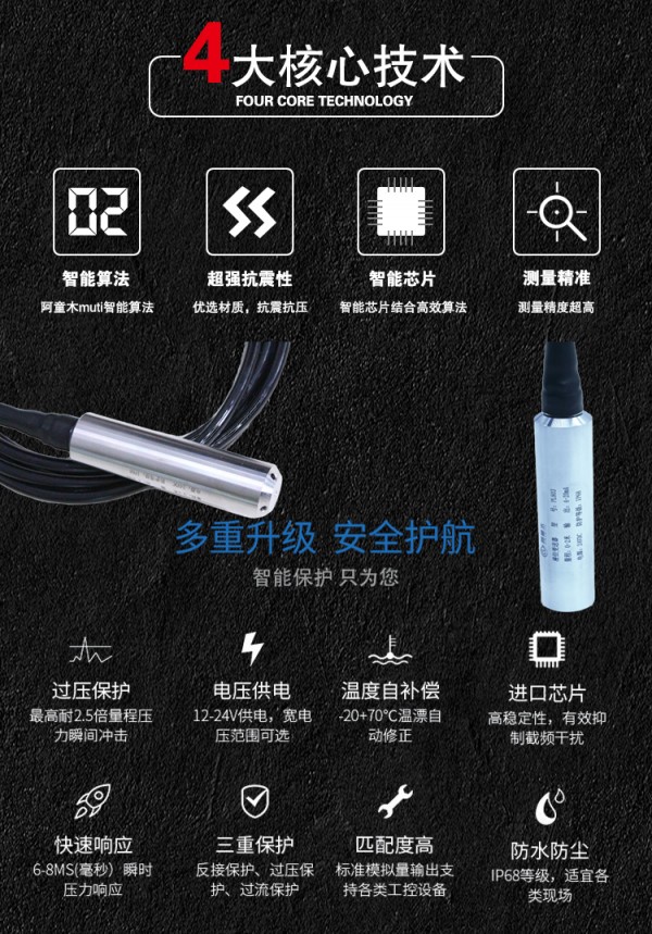 投入式液位變送器是基于所測(cè)液體靜壓與該液體高度成正比的原理,采用擴(kuò)散硅或陶瓷敏感元件的壓阻效應(yīng),將靜壓轉(zhuǎn)成電信號(hào)。經(jīng)過(guò)溫度補(bǔ)償和線性校正。轉(zhuǎn)換成4-20mADC標(biāo)準(zhǔn)電流信號(hào)輸出。