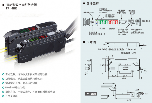智能型數(shù)字光纖傳感器FA1-E的特性:(1)零點(diǎn)遷移,飽和恢復(fù)和抗光干擾等功能(2)功能強(qiáng)大,響應(yīng)速度較快可達(dá)50us(3)常開常閉互換,并具有延時(shí)功能光纖放大器 物體顏色識別光纖傳感器