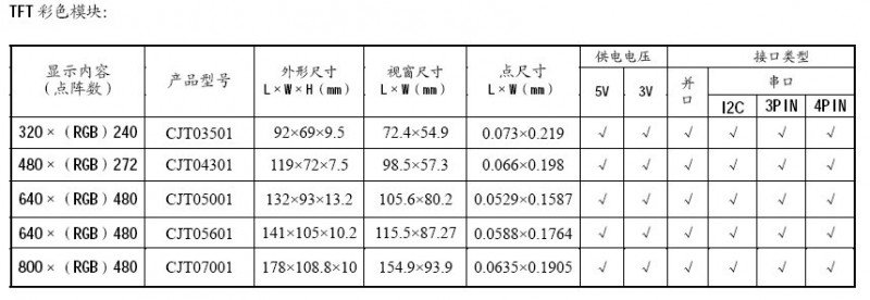 5.0寸TFT彩色液晶模塊產品參數、程序編程資料、接口定義。型號: CJT05001BN 顯示內容(點陣數): 640 3(RGB)480外形尺寸/mm(