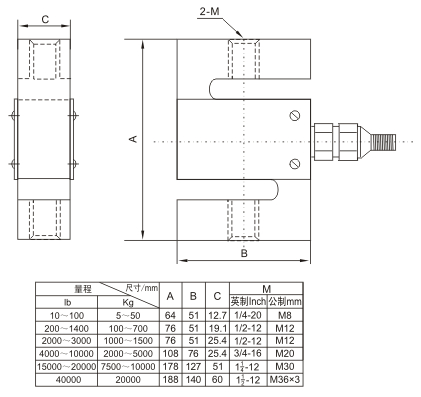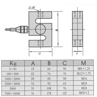 承受拉、壓力均可,輸出對稱性好。精度高、結構緊湊,規格齊全。 適用于配料秤、機電結合稱、吊鉤秤及其它力值的測量與控制。 二、量程、規格、外形及安裝尺寸 5,10,20,30,100,200,300,500kg, 1,2,3,5,10,15,20t 三、技術參數: