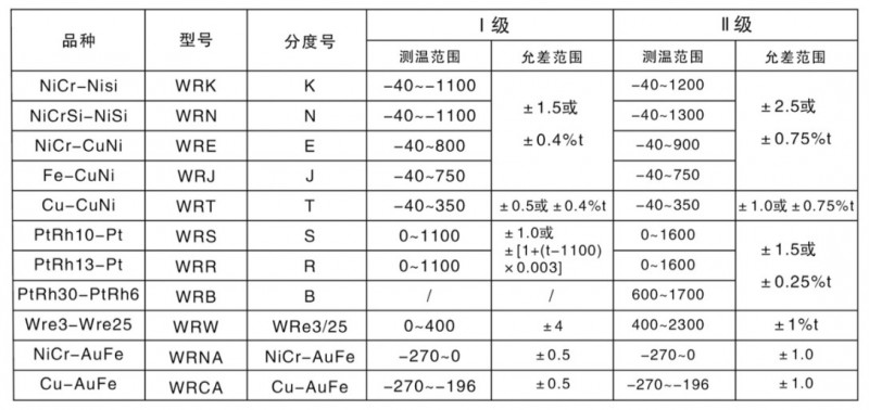 六、 熱電偶(熱電阻)的種類和參數: