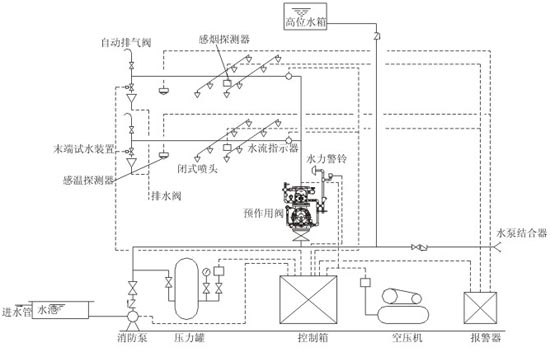 | 預作用滅火系統是由火災探測系統自動控制的帶預作用閥門的閉式噴水滅火系統,預作用滅火系統采用閉式噴頭,用于保護不允許水漬損失的建筑物,以防止由于噴頭意外破裂造成對保護區域的水漬損失,正常工作狀態下,預作用噴水滅火系統管網內沒有水而充以0.03-0.05Mpa的低壓空氣,低壓氣體用于檢測管網是否有泄漏或噴頭是否有破裂。 |