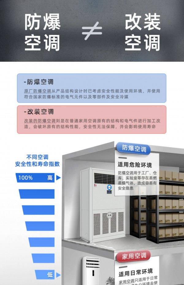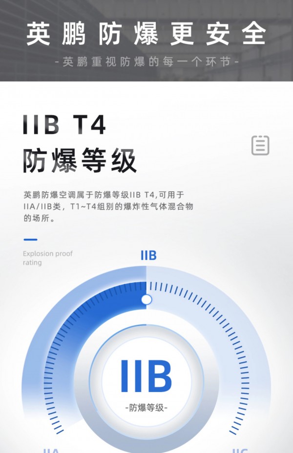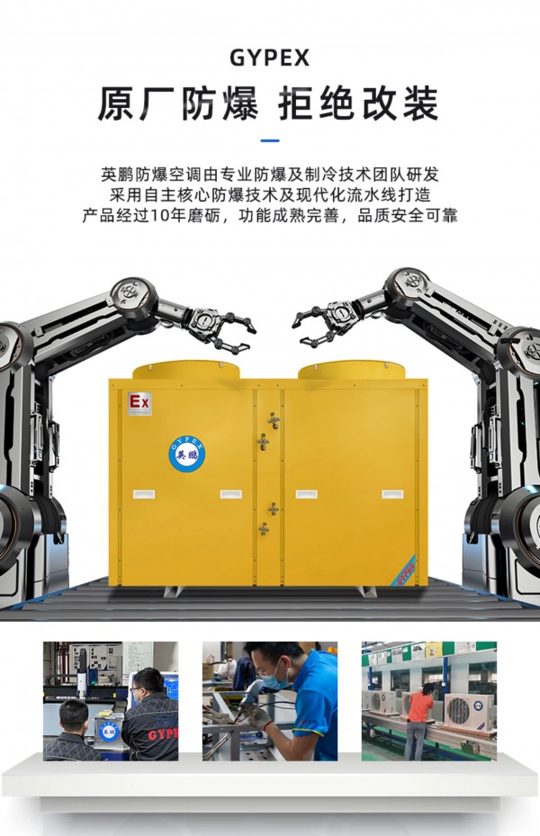 擁有IIB T4防爆等級,內外機鈑金外殼、內置式防爆電氣控制柜、更安全防爆制冷劑、高性能防爆壓縮機