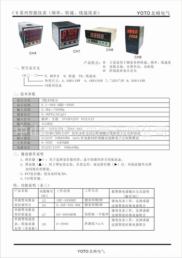YOTO中山北崎電氣有限公司,是以生產及銷售為一體的公司,生產及銷售:電流電壓表,功率表,單相三相電參數表,計數計米器,轉速、頻率、線速表,數顯變頻器傳感器數顯示儀,時間繼電器、計時器,智能溫控表、接近開關、光電開關、霍爾開關,旋轉編碼器,壓力傳感器(變送器)、數顯壓力表等多種儀表,如有特殊要求可以訂做,優良的產品質量,優惠的產品價格,完善的售后服務,以“誠信、務實、守約、快捷”為服務準則。