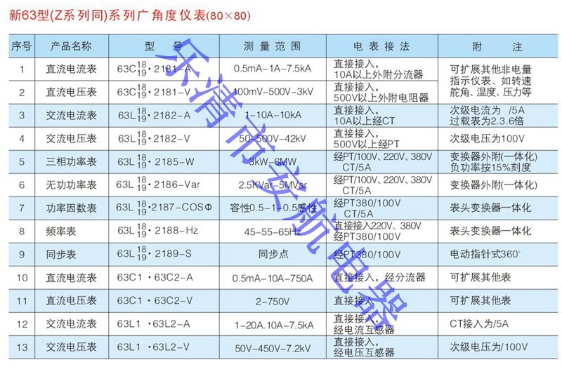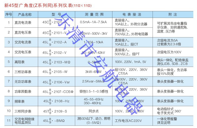 專業生產船用儀表型號有:F96,Q96,51L5,51L6,F72,Q72,61L13,61L14,45L8,45L9,2101,2102,2103,2104,2105,2106,2107,2108,2109,63L1,63L2,63L10,63L18,63L192182,2185,2186,2187,2188,2189,45D1,45C1,13D1,13C1,45C3,45L1,63C11,63C7,63L7,62C12,69C7,69L7,84C2,84L2型等系列安裝式電表。及JDB-2交流電網緣電阻監測報警器;ZDB-24型直流電網緣電阻監測報警器,電子式同步指示器(SM表)和DMF-1同期脈沖發送裝置;NGJ-1逆功率繼電器;DB-A多功能保護裝置;MPMI多功能電力監測儀;THJDG4-0.5TH型船用電壓互感器。