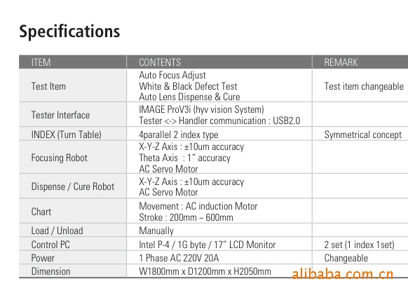 | 測量范圍 | Auto Focus Adjust White,Black Defect Test Auto Lens Dispense,Cure | 測量精度 | X-Y-Z Axis:+/-10um accuracy Theta Axis:1''accuracy AC Servo Motor |