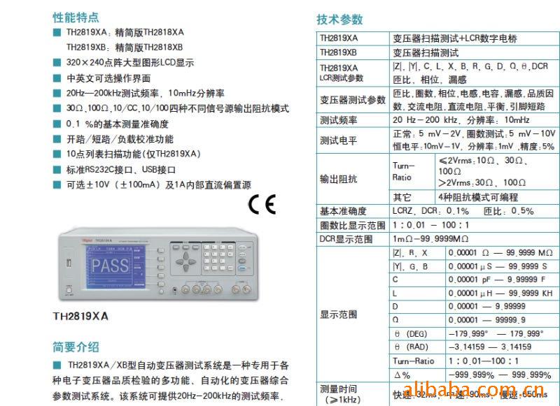 TH2819XB自動變壓器測試系統是在深受用戶好評的TH2818XB的基礎上推出的新一代電子變壓器測試系統,繼承了TH2818XB操作簡便(操作界面兼容)、讀數準確穩定的特點,體積較之大為減小、外觀令人耳目一新、價格低廉。 TH2819XB是一種專用于各種電子變壓器品質檢驗的多功能、自動化的變壓器綜合參數測試系統。可提供20Hz-200kHz的測試頻率,變壓器掃瞄測試涵蓋了變壓器的各種低壓參數,包括主參數電感L、漏感量Lk、圈數比Turn-ratio、直流電阻DCR、阻抗Z、線圈間容量C,副參數品質因素Q、串聯等效電阻額ESR、相位Ps,以及引腳短路檢查等。本系統采用的數字采樣技術及高速長壽命掃描測試夾具,使以往費時低效的變壓器檢驗變得快速、。該系統可選擇多種輸出阻抗模式,使測試儀器間因輸出阻抗差異造成的電感量差異問題得以完善解決。選擇電感量換算的圈數比測量技術,可大大改善低藕合系數變壓器因漏磁過高引起之圈數比量測誤差問題。 TH2819XB還是一種高速度、測試范圍寬、6位測試分辨率的阻抗測量儀,可滿足生產線質量保證、進貨檢驗及實驗室測量要求。