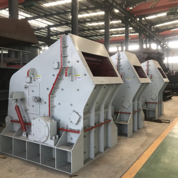 反擊式破碎機在電動機的帶動下,轉子高速旋轉,物料進入板錘作用區時,與轉子上的板錘撞擊破碎,后又被拋向反擊裝置上再次破碎,然后又從反擊襯板上彈回到板錘作用區重新破碎,此過程重復進行,物料由大到小進入一、二、三反擊腔重復進行破碎,直到物料被破碎至所需粒度,由出料口排出。調整反擊架與轉子之間的間隙可達到改變物料出料粒度和物料形狀的目的。