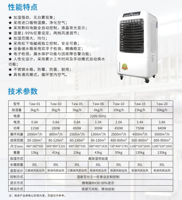 百科特奧10kg加濕機Taw-10、10kg濕膜加濕機Taw-10。特點:加濕潔凈,無傳統加濕器的污染;水不需處理,只要將水分蒸發就可清潔加濕;水泵的循環水量大于加濕量,多余的水用于清洗蒸發濕膜,蒸發濕膜不產生水垢;蒸發濕膜對空氣具有凈化作用,有除去室內空氣中的灰塵和溶于水的有害氣體;室內顯熱負荷大時,利用室內干熱空氣進行蒸發汽化;具有良好的制冷效果。