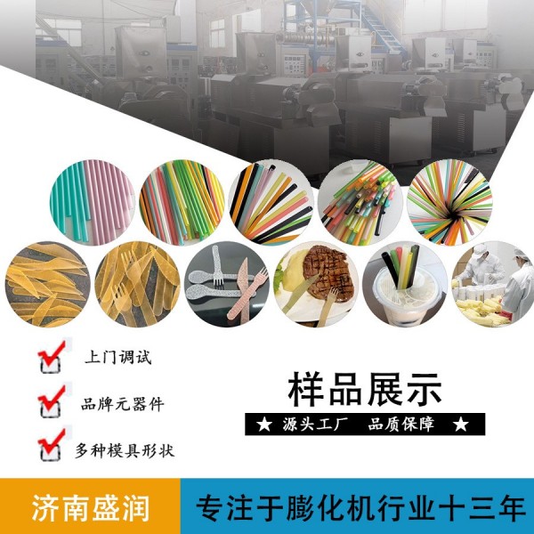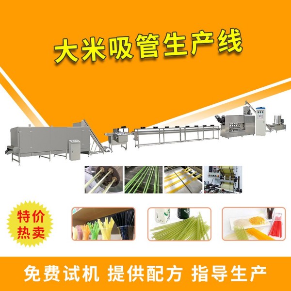 大米吸管生產線以大米粉、木薯淀粉等為主要原料,由吸管擠壓機制成不同直徑大小的吸管胚料,經切斷機剪切成不同形狀和尺寸的吸管,再經特制烤箱烘干。所生產的吸管外表光滑,質地透亮,壁薄。